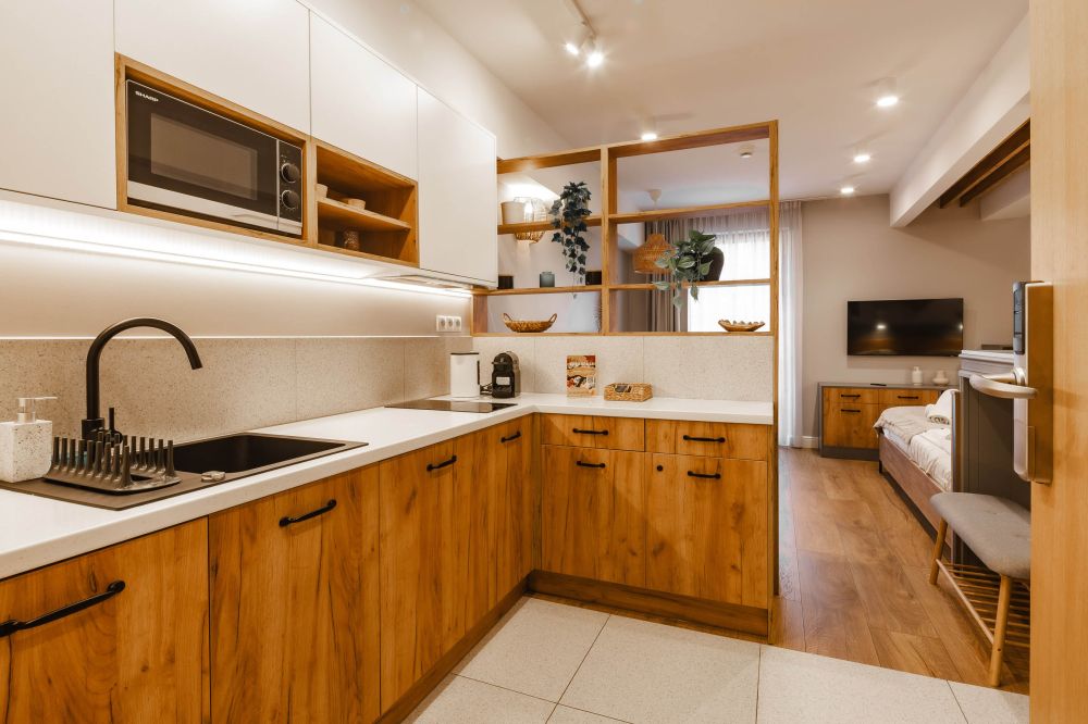 Struktura apartamentu: przedpokój, salon z aneksem kuchennym, łazienka, taras.