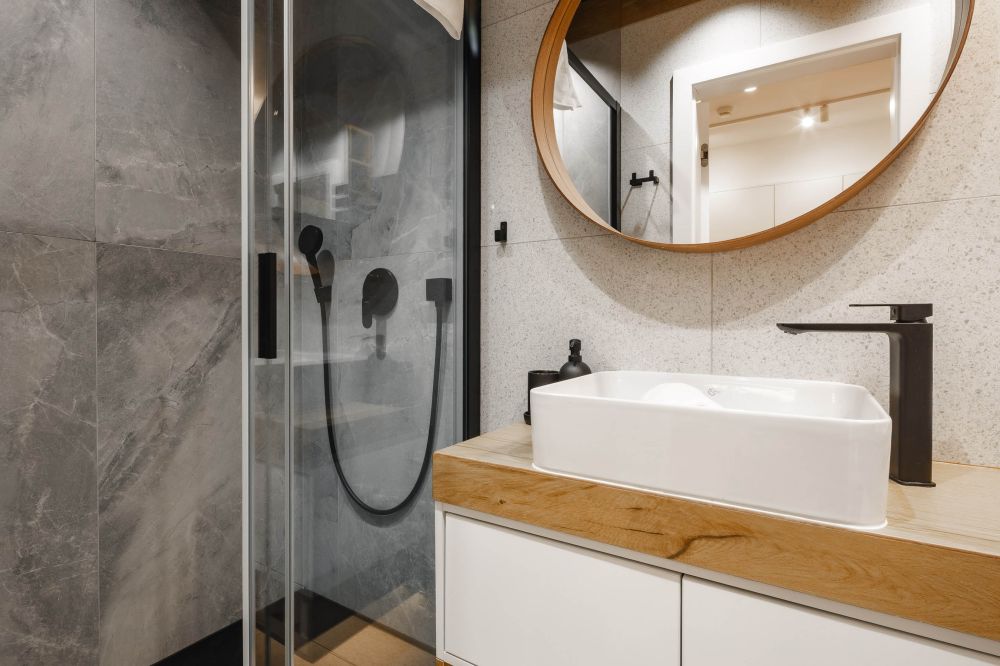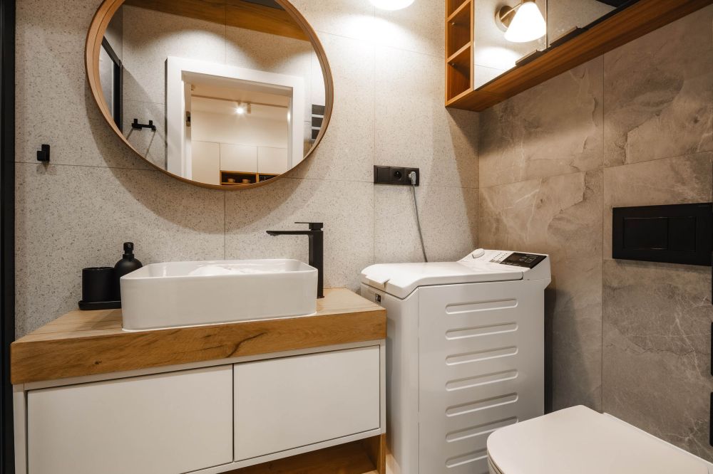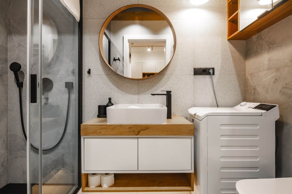 Łazienka: kabina prysznicowa, umywalka, toaleta, lustro, pralka, suszarka do włosów