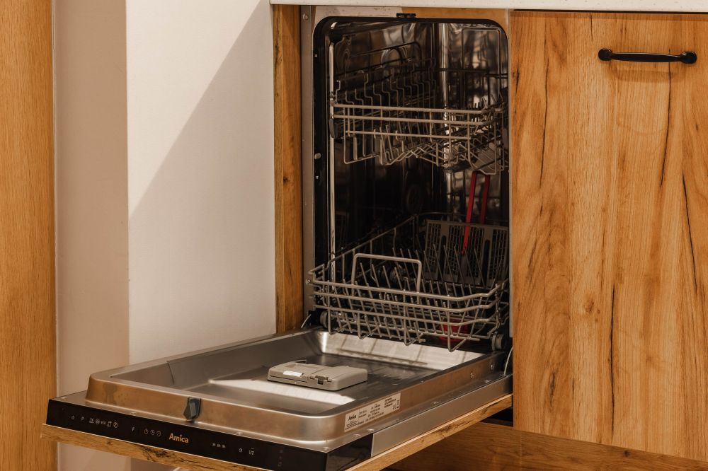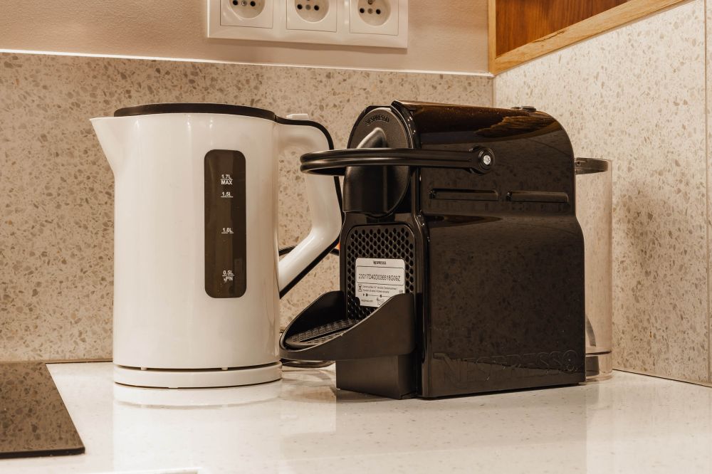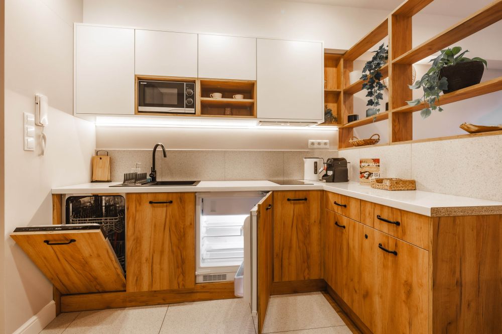 Aneks kuchenny: lodówka, zmywarka, kuchenka mikrofalowa, czajnik elektryczny, ekspres do kawy (kapsułkowy - Nespresso), 2 palnikowa płyta elektryczna, komplet naczyń i sztućców, garnki, naczynia, zastawa szklana