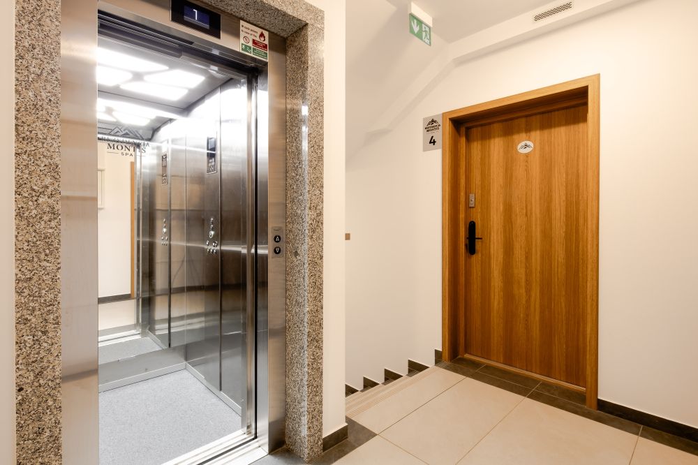 Struktura Apartamentu: salon z aneksem kuchennym z wyjściem na balkon z meblami ogrodowymi: stolik i dwa krzesła, widok na Tatry przysłonięty drzewami pomiędzy budynkami, dwie zamykane sypialnie, łazienka