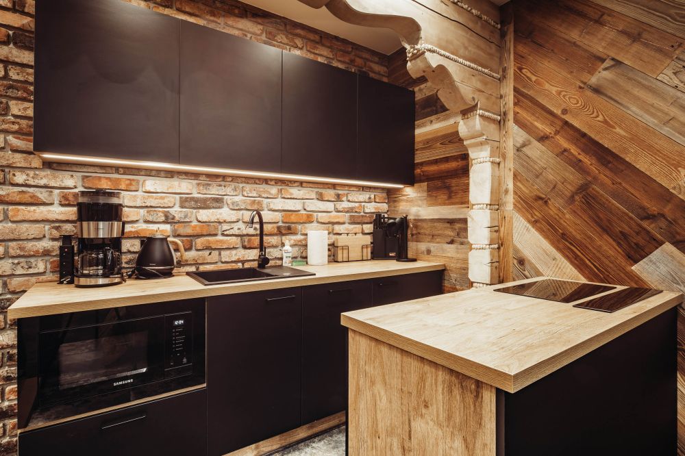 Aneks kuchenny: lodówka, kuchenka mikrofalowa, zmywarka, czajnik elektryczny, ekspres do kawy, komplet naczyń i sztućców, garnki do gotowania, zastawa szklana. W aneksie kuchennym znajduje się wyspa kuchenna z płytą indukcyjną do gotowania wysuwany okap.