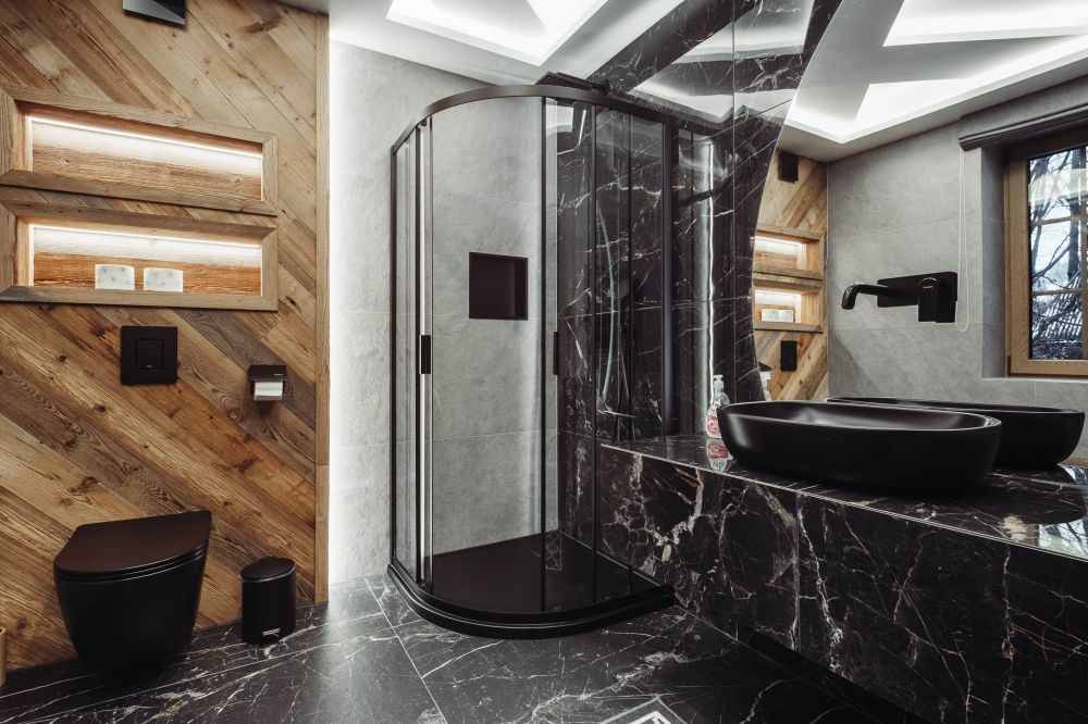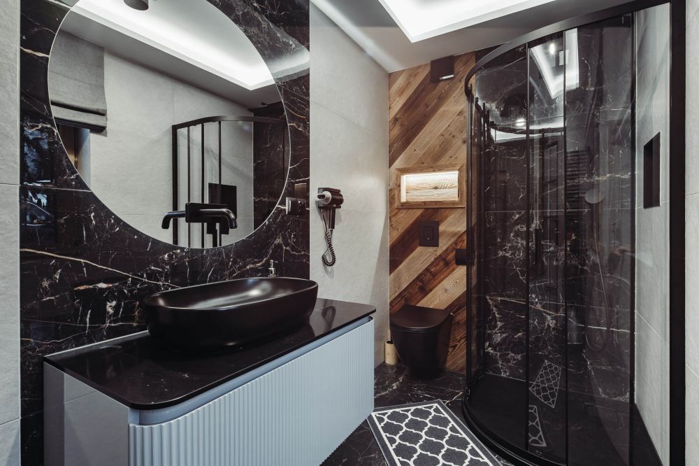 Łazienka: kabina prysznicowa, umywalka, toaleta, duże lustro, podgrzewana podłoga.