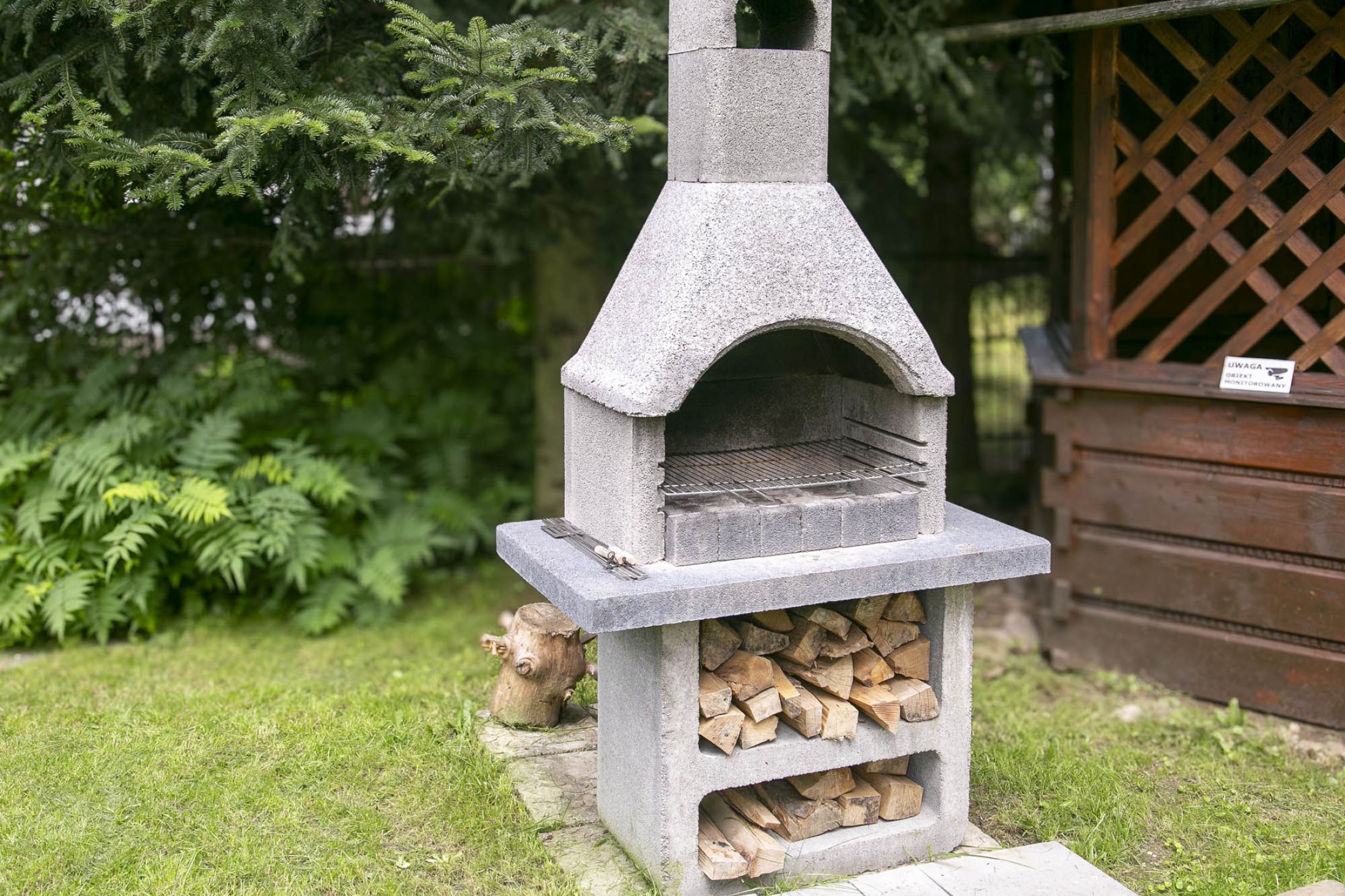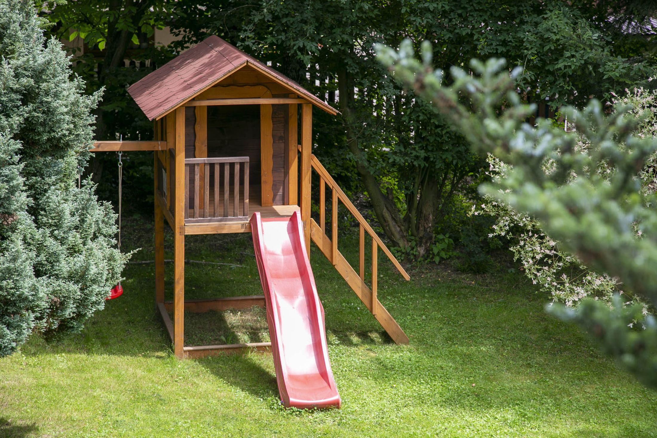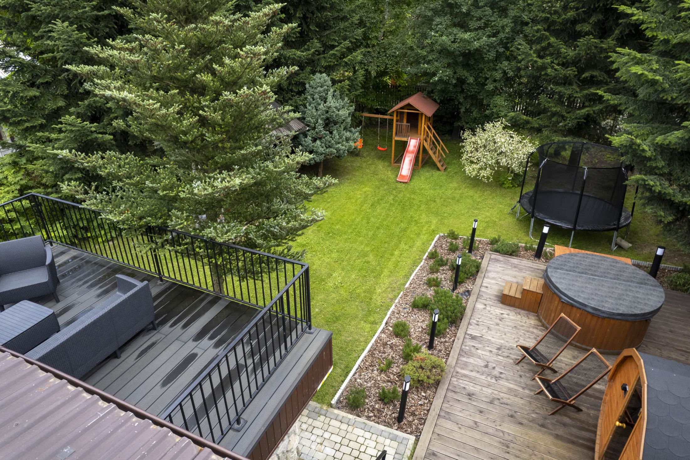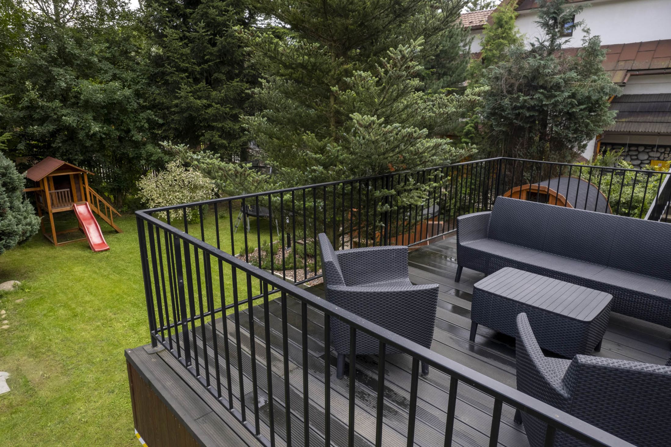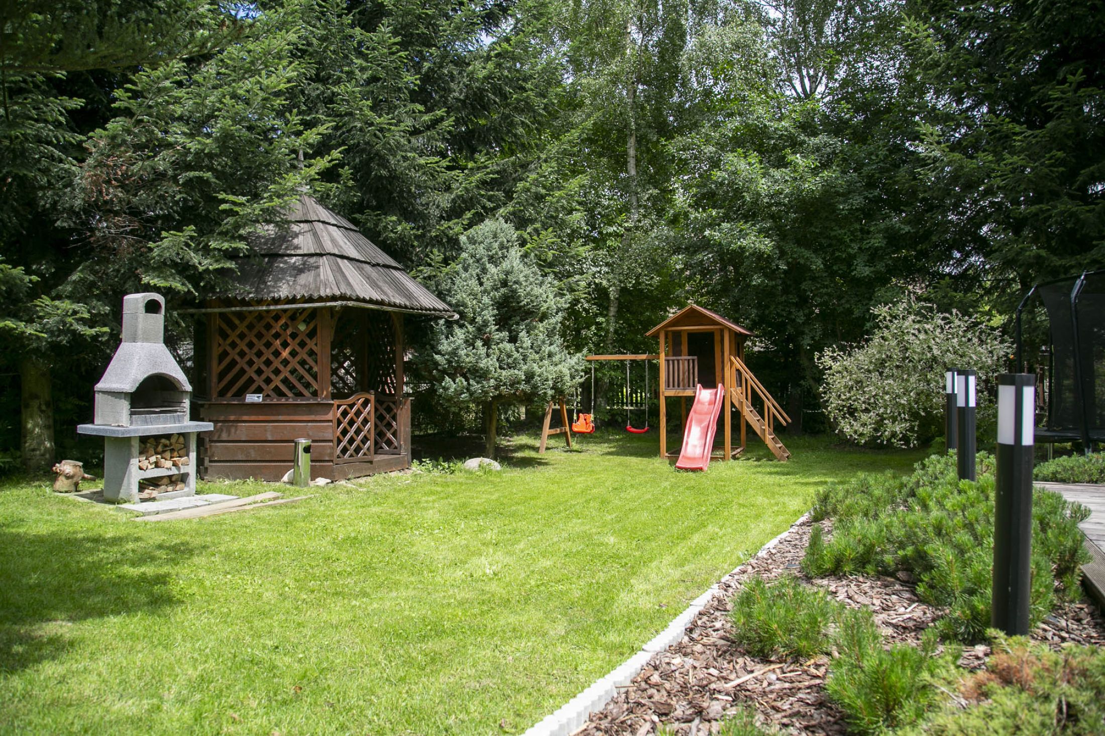Przed budynkiem znajduje się parking samochodowy (5 miejsc postojowych), a także piękny zielony ogród z altanką wypoczynkową i miejscem do zabaw dla dzieci (huśtawki, zjeżdżalnie i trampolina). Do budynku przylega taras na którym znajduje się grill i leżaki wypoczynkowe. Całość terenu jest ogrodzona i monitorowana. Wewnątrz budynku znajduje się oranżeria z meblami wypoczynkowymi i dużym 100 calowym TV. W budynku znajduje się także ogólnodostępna pralka. Na terenie całego obiektu dostępne jest bezpłatne WiFi.