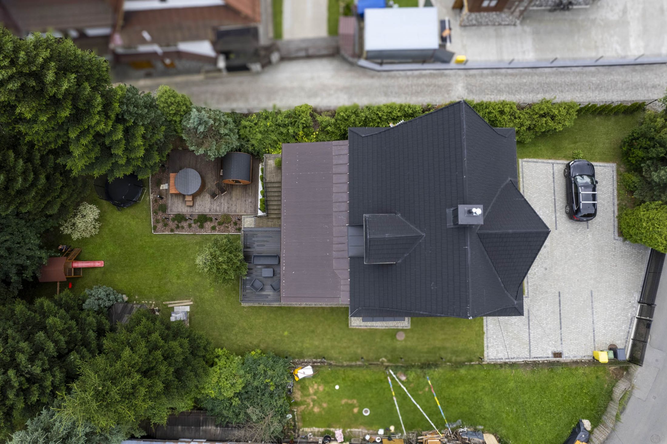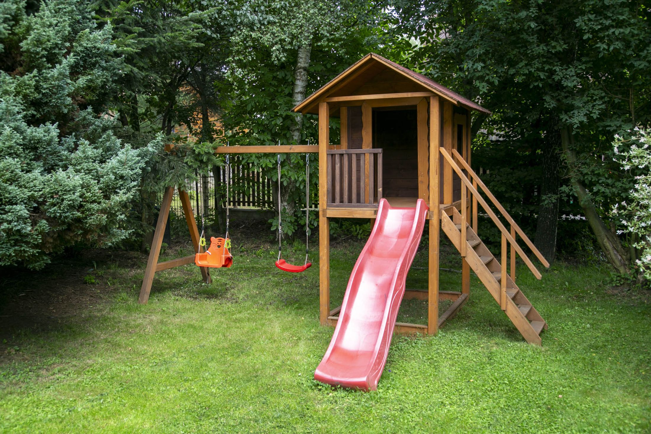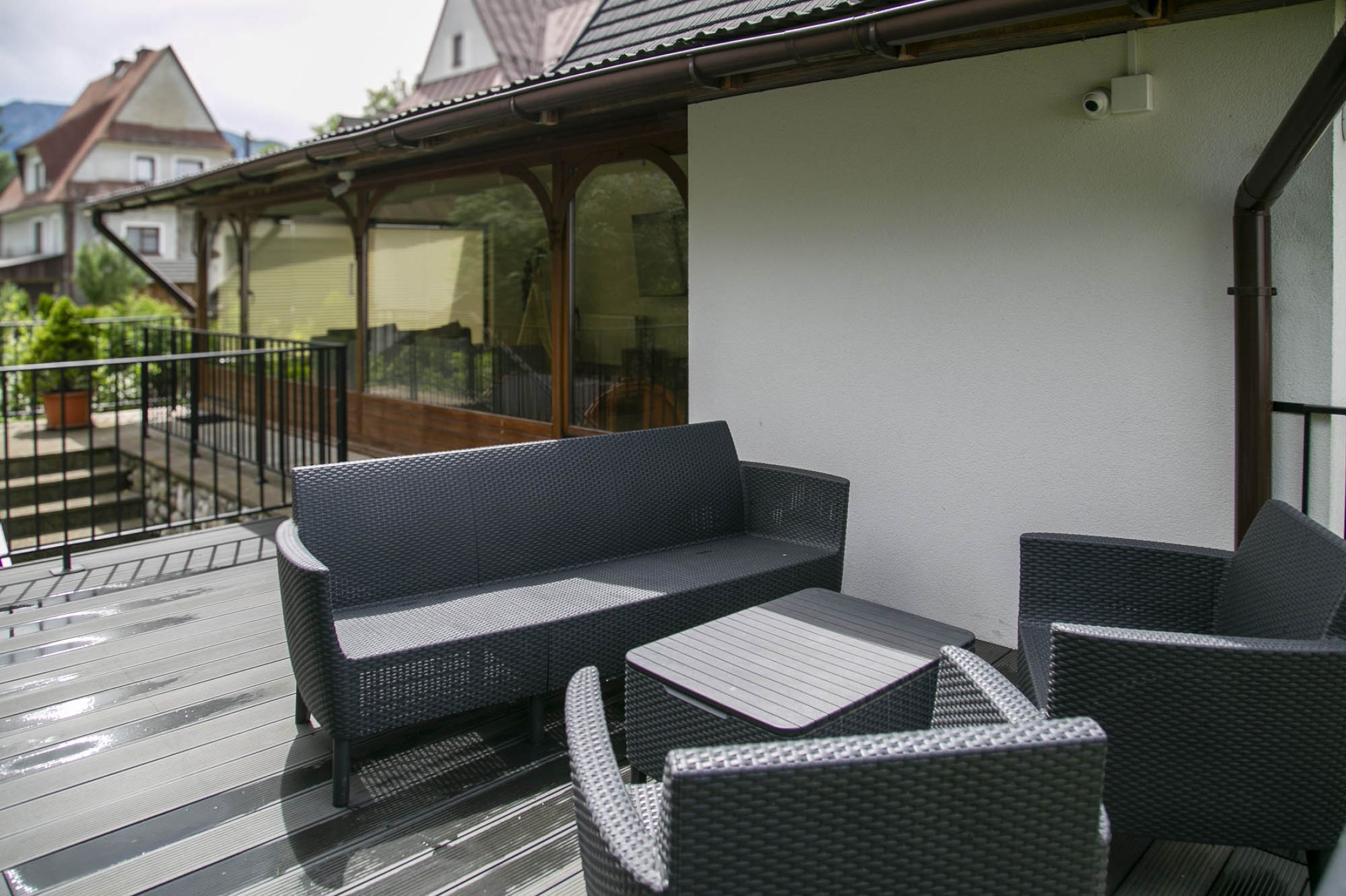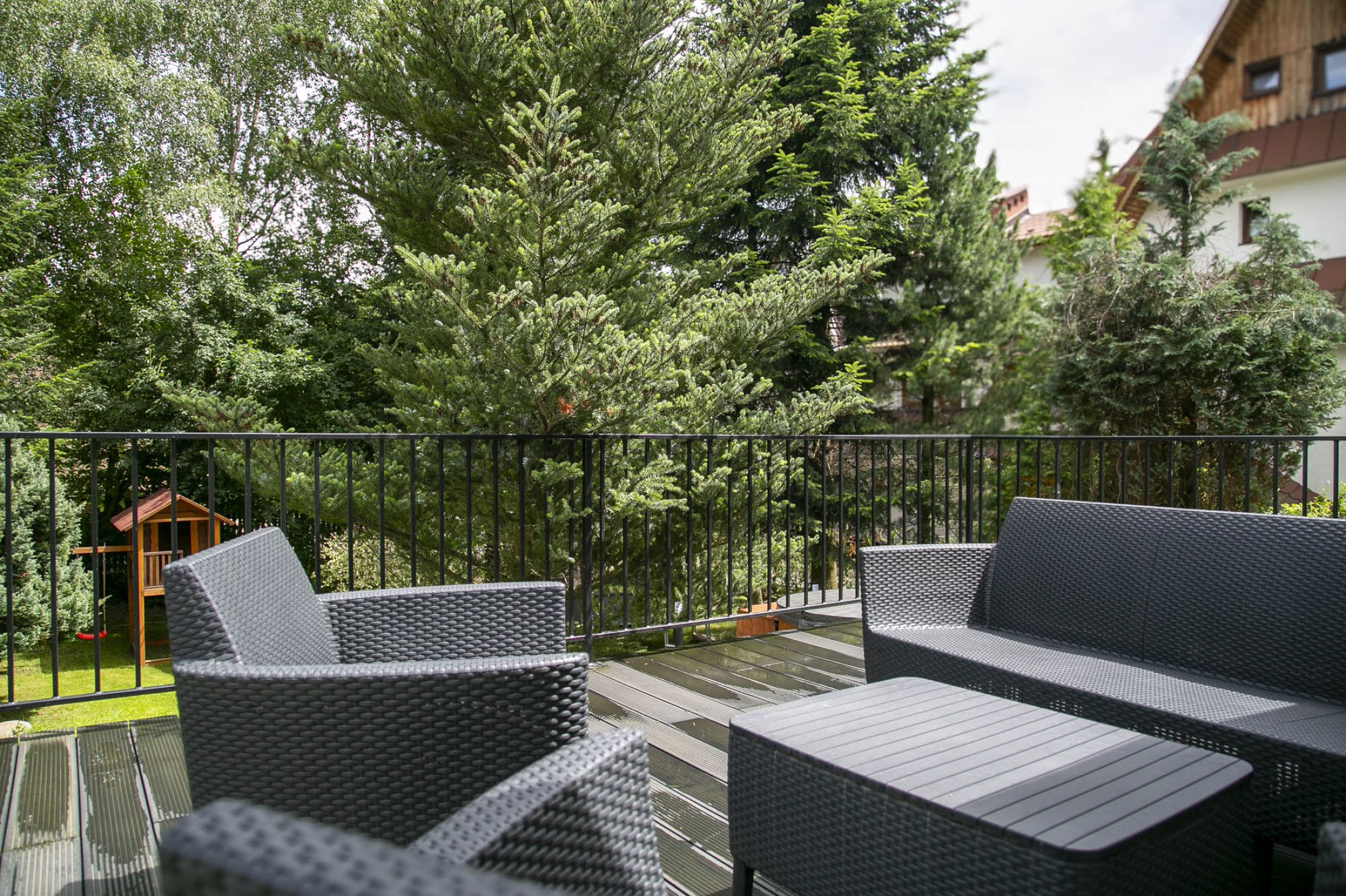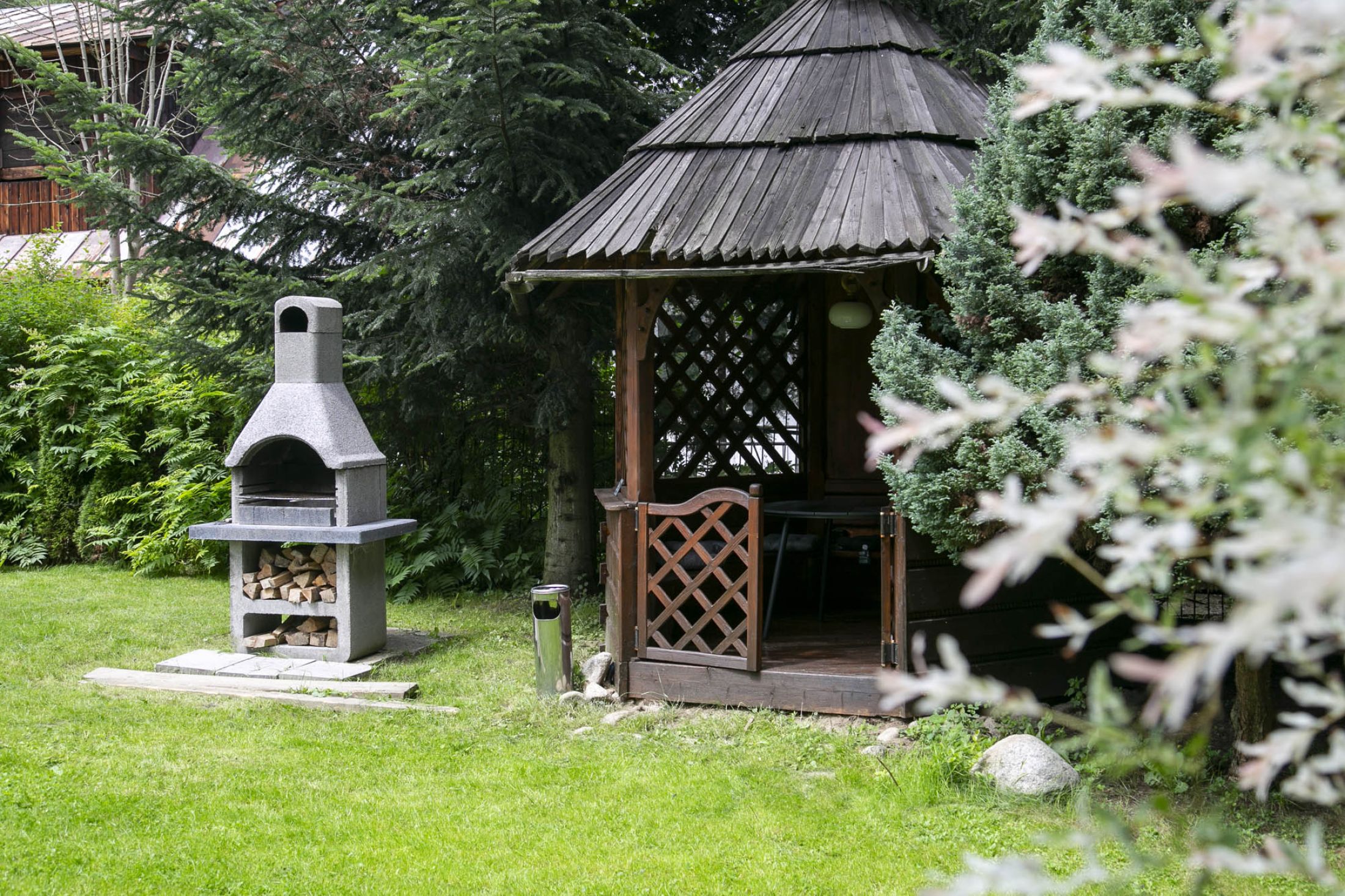 Przed budynkiem znajduje się parking samochodowy (5 miejsc postojowych), a także piękny zielony ogród z altanką wypoczynkową i miejscem do zabaw dla dzieci (huśtawki, zjeżdżalnie i trampolina). Do budynku przylega taras na którym znajduje się grill i leżaki wypoczynkowe. Całość terenu jest ogrodzona i monitorowana. Wewnątrz budynku znajduje się oranżeria z meblami wypoczynkowymi i dużym 100 calowym TV. W budynku znajduje się także ogólnodostępna pralka. Na terenie całego obiektu dostępne jest bezpłatne WiFi.